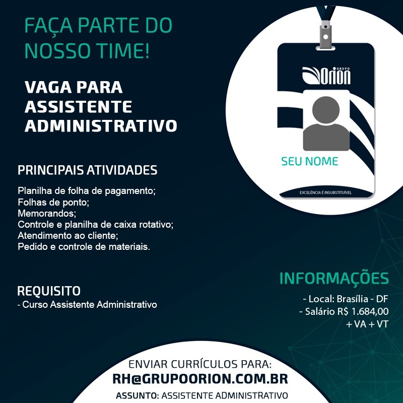 Aviso: O site não é responsável pela seleção ou contratação das vagas, o mesmo atua somente na divulgação, para que o contratante tenha um alcance maior de visualizações em suas oportunidades de empregos. É imprescindível informar que esta vaga foi encontrada no site OPORTUNIDADES DF, informe da seguinte forma: “Esta vaga foi vista no site “www.oportunidadesdf.com“.