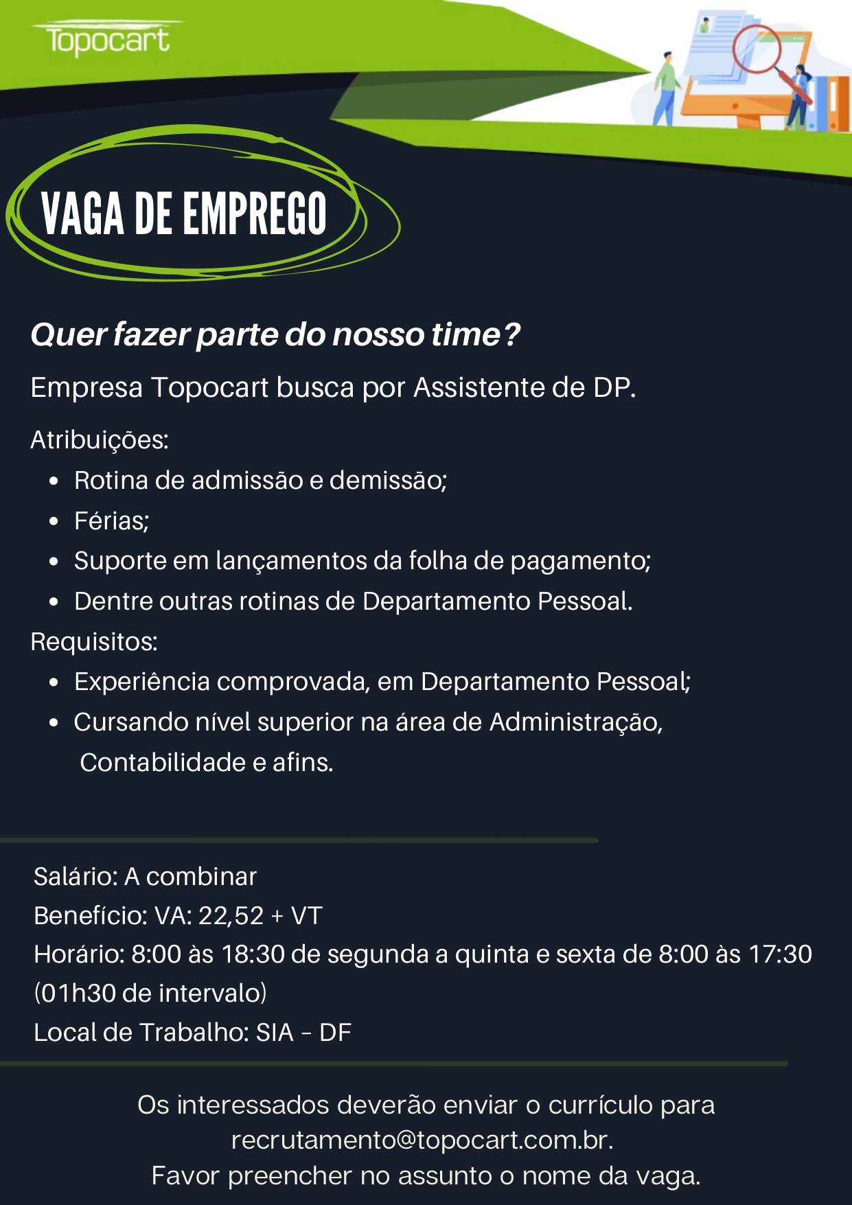 Aviso: O site Oportunidades DF tem como único objetivo divulgar vagas de emprego e com isso ajudar tanto quem está na procura de emprego, quanto quer contratar. Porém o mesmo não é responsável e nem atua na seleção ou contratação das vagas e por isso toda responsabilidade das vagas anunciadas são das empresas ou encarregados de rh que nos repassam as oportunidades de emprego. Em caso de uma vaga falsa ou uma fraude, nos contate imediatamente. É imprescindível informar que esta vaga foi encontrada no site OPORTUNIDADES DF, informe da seguinte forma: “Esta vaga foi vista no site “www.oportunidadesdf.com“.