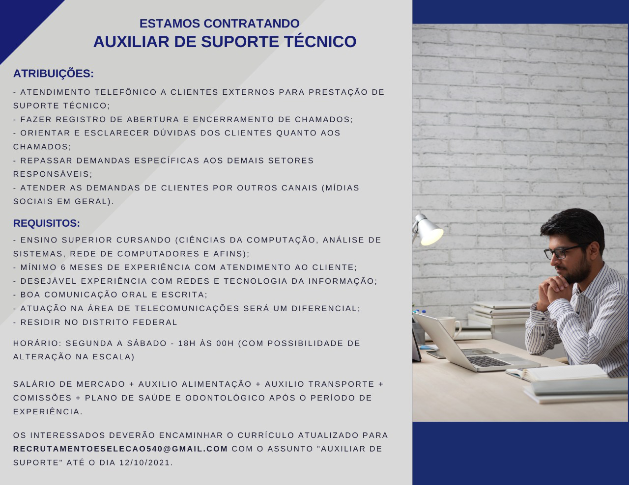 Aviso: O site Oportunidades DF tem como único objetivo divulgar vagas de emprego e com isso ajudar tanto quem está na procura de emprego, quanto quer contratar. Porém o mesmo não é responsável e nem atua na seleção ou contratação das vagas e por isso toda responsabilidade das vagas anunciadas são das empresas ou encarregados de rh que nos repassam as oportunidades de emprego. Em caso de uma vaga falsa ou uma fraude, nos contate imediatamente. É imprescindível informar que esta vaga foi encontrada no site OPORTUNIDADES DF, informe da seguinte forma: “Esta vaga foi vista no site “www.oportunidadesdf.com“.