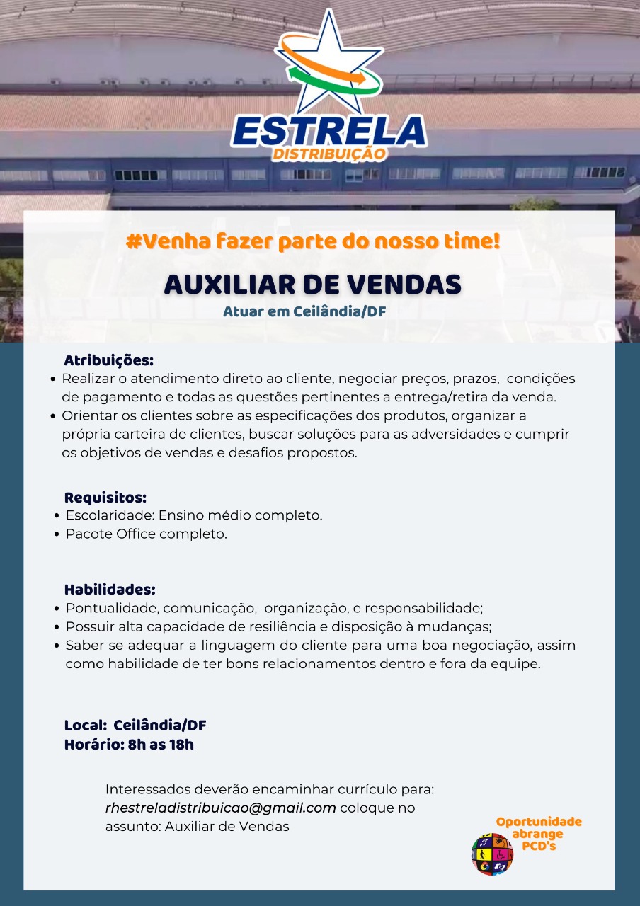 AVISO: O site Oportunidades DF tem como único objetivo divulgar vagas de emprego e com isso ajudar tanto quem está à procura de emprego, quanto quem busca contratar. Porém, o mesmo não é responsável e nem atua na seleção ou contratação das vagas. e por isso, toda a responsabilidade das vagas anunciadas são das empresas ou encarregadas(os) do RH que nos repassam as oportunidades de emprego. Em caso de uma vaga falsa ou uma fraude, solicitamos que nos contate imediatamente.