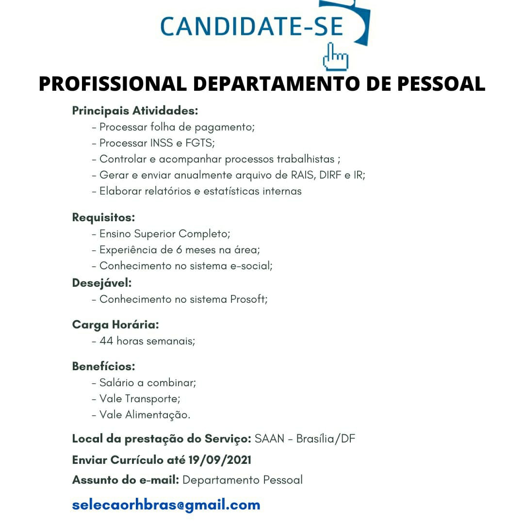 Aviso: O site Oportunidades DF tem como único objetivo divulgar vagas de emprego e com isso ajudar tanto quem está na procura de emprego, quanto quer contratar. Porém o mesmo não é responsável e nem atua na seleção ou contratação das vagas e por isso toda responsabilidade das vagas anunciadas são das empresas ou encarregados de rh que nos repassam as oportunidades de emprego. Em caso de uma vaga falsa ou uma fraude, nos contate imediatamente. É imprescindível informar que esta vaga foi encontrada no site OPORTUNIDADES DF, informe da seguinte forma: “Esta vaga foi vista no site “www.oportunidadesdf.com“.