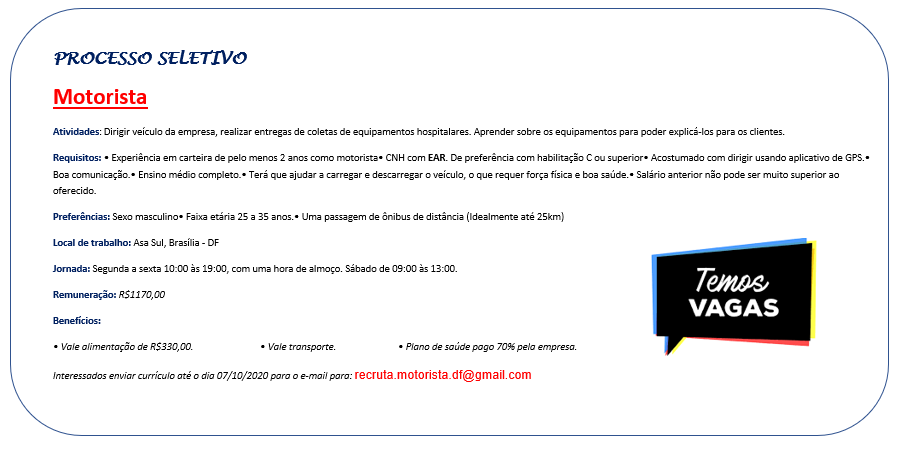 Aviso: O site não é responsável pela seleção ou contratação das vagas, o mesmo atua somente na divulgação, para que o contratante tenha um alcance maior de visualizações em suas oportunidades de empregos. É imprescindível informar que esta vaga foi encontrada no site OPORTUNIDADES DF, informe da seguinte forma: “Esta vaga foi vista no site “www.oportunidadesdf.com“.