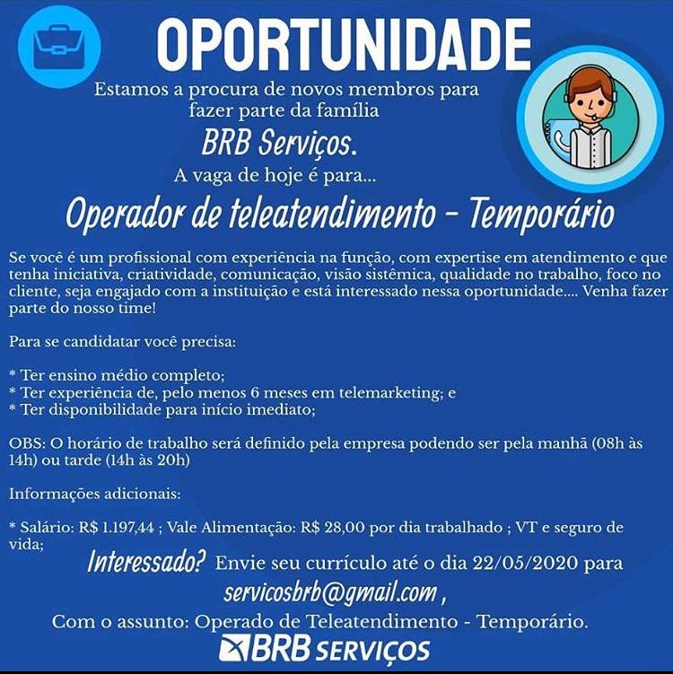 Aviso: O site não é responsável pela seleção ou contratação das vagas, o mesmo atua somente na divulgação, para que o contratante tenha um alcance maior de visualizações em suas oportunidades de empregos. É imprescindível informar que esta vaga foi encontrada no site OPORTUNIDADES DF, informe da seguinte forma: “Esta vaga foi vista no site “www.oportunidadesdf.com“.