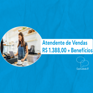 Vaga: Atendente de Balcão Remuneração: Salário + Vale Transporte + Vale Alimentação Local: Sudoeste Jornada: Segunda a sexta, 09:00 às 18:00 e aos sábados das 09:00 às 14:00 Requisitos: Ensino médio completo; – Noções de informática; – Seja proativo; – Boa comunicação; – Experiência com atendimento ao público será um diferencial. Interessados deverão enviar currículo […]