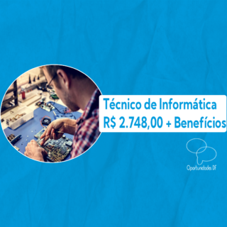 TÉCNICO DE INFORMÁTICA soma desenvolvimento Híbrido R$ 2.748,00 + Assistência médica + Assistência odontológica + Vale-refeição + Vale-transporte Brasília, DF, BR Segunda a sexta, das 08h às 18h Profissional • Temporário Descrição e Responsabilidades TÉCNICO DE INFORMÁTICA Manutenção, configuração, atualização e reparos de computadores e periféricos; Suporte e atendimento ao usuário, fornecendo orientações e atualização […]